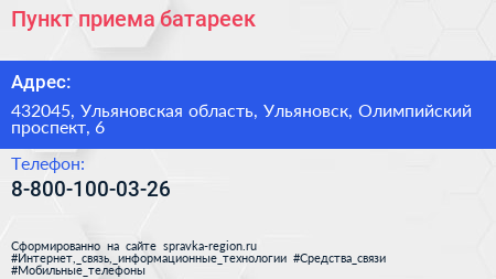 Пункт приема батареек по адресу 432045, Ульяновская область, Ульяновск, Олимпийский проспект, 6 в дальнейшем Организация, размещена в следующих категориях: