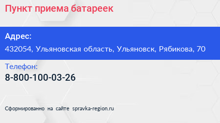 Пункт приема батареек по адресу 432054, Ульяновская область, Ульяновск, Рябикова, 70 в дальнейшем Организация, размещена в следующих категориях: