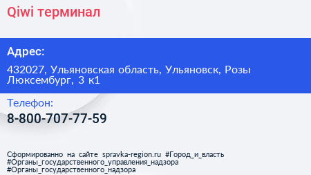 Qiwi, терминал по адресу 432027, Ульяновская область, Ульяновск, Розы Люксембург, 3 к1 в дальнейшем Организация, размещена в следующих категориях: