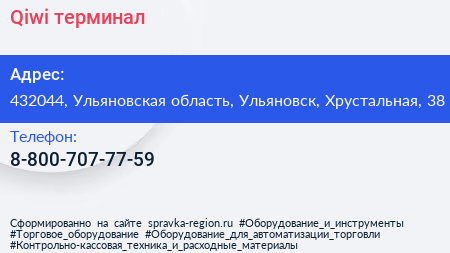Qiwi, терминал по адресу 432044, Ульяновская область, Ульяновск, Хрустальная, 38 в дальнейшем Организация, размещена в следующих категориях: