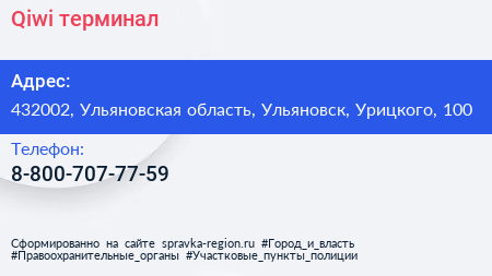 Qiwi, терминал по адресу 432002, Ульяновская область, Ульяновск, Урицкого, 100 в дальнейшем Организация, размещена в следующих категориях: