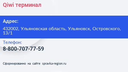 Qiwi, терминал по адресу 432002, Ульяновская область, Ульяновск, Островского, 13/1 в дальнейшем Организация, размещена в следующих категориях: