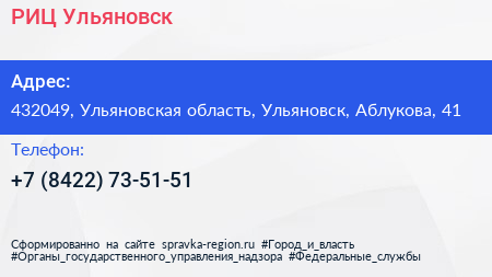 РИЦ-Ульяновск по адресу 432049, Ульяновская область, Ульяновск, Аблукова, 41 в дальнейшем Организация, размещена в следующих категориях: