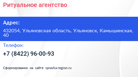 Ритуальное агентство по адресу 432054, Ульяновская область, Ульяновск, Камышинская, 40 в дальнейшем Организация, размещена в следующих категориях: