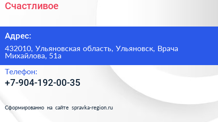 Счастливое по адресу 432010, Ульяновская область, Ульяновск, Врача Михайлова, 51а в дальнейшем Организация, размещена в следующих категориях:
