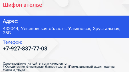 Шифон, ателье по адресу 432044, Ульяновская область, Ульяновск, Хрустальная, 35Б в дальнейшем Организация, размещена в следующих категориях:
