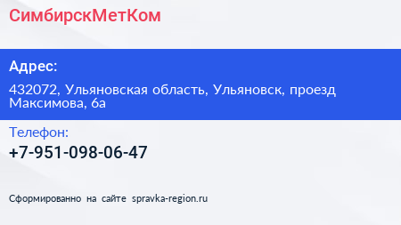СимбирскМетКом по адресу 432072, Ульяновская область, Ульяновск, проезд Максимова, 6а в дальнейшем Организация, размещена в следующих категориях: