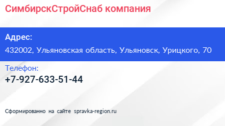 СимбирскСтройСнаб, компания по адресу 432002, Ульяновская область, Ульяновск, Урицкого, 70 в дальнейшем Организация, размещена в следующих категориях: