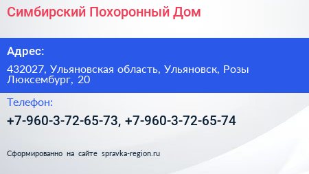 Симбирский Похоронный Дом по адресу 432027, Ульяновская область, Ульяновск, Розы Люксембург, 20 в дальнейшем Организация, размещена в следующих категориях: