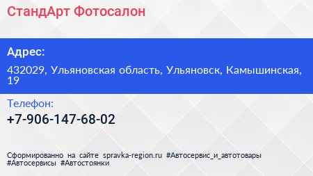 СтандАрт, Фотосалон по адресу 432029, Ульяновская область, Ульяновск, Камышинская, 19 в дальнейшем Организация, размещена в следующих категориях: