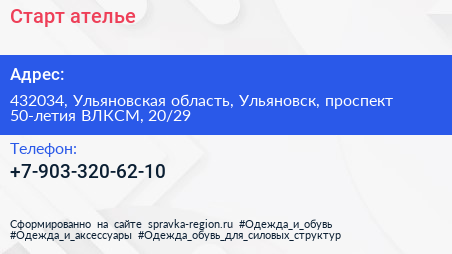 Старт, ателье по адресу 432034, Ульяновская область, Ульяновск, проспект 50-летия ВЛКСМ, 20/29 в дальнейшем Организация, размещена в следующих категориях:
