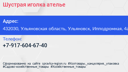 Шустрая иголка, ателье по адресу 432030, Ульяновская область, Ульяновск, Ипподромная, 4а в дальнейшем Организация, размещена в следующих категориях: