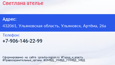 Светлана, ателье по адресу 432061, Ульяновская область, Ульяновск, Артёма, 26а в дальнейшем Организация, размещена в следующих категориях: