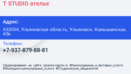 T-STUDIO, ателье по адресу 432054, Ульяновская область, Ульяновск, Камышинская, 43в в дальнейшем Организация, размещена в следующих категориях: