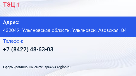 ТЭЦ №1 по адресу 432049, Ульяновская область, Ульяновск, Азовская, 84 в дальнейшем Организация, размещена в следующих категориях: