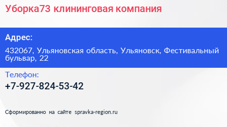Уборка73, клининговая компания по адресу 432067, Ульяновская область, Ульяновск, Фестивальный бульвар, 22 в дальнейшем Организация, размещена в следующих категориях: