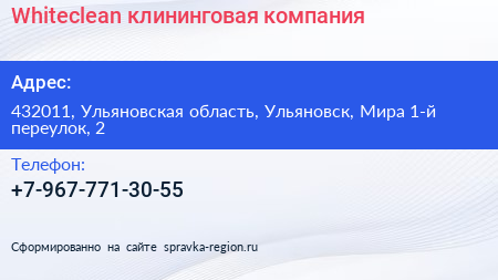 Whiteclean, клининговая компания по адресу 432011, Ульяновская область, Ульяновск, Мира 1-й переулок, 2 в дальнейшем Организация, размещена в следующих категориях: