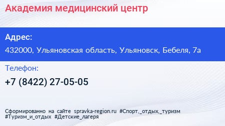 Академия, медицинский центр по адресу 432000, Ульяновская область, Ульяновск, Бебеля, 7а в дальнейшем Организация, размещена в следующих категориях: