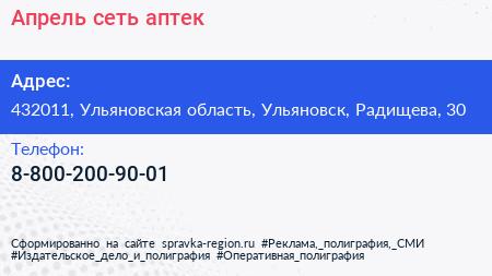 Апрель, сеть аптек по адресу 432011, Ульяновская область, Ульяновск, Радищева, 30 в дальнейшем Организация, размещена в следующих категориях: