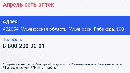 Апрель, сеть аптек по адресу 432054, Ульяновская область, Ульяновск, Рябикова, 100 в дальнейшем Организация, размещена в следующих категориях: