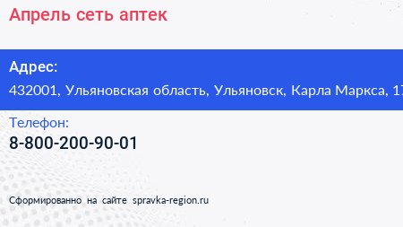 Апрель, сеть аптек по адресу 432001, Ульяновская область, Ульяновск, Карла Маркса, 17 в дальнейшем Организация, размещена в следующих категориях: