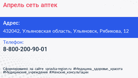 Апрель, сеть аптек по адресу 432042, Ульяновская область, Ульяновск, Рябикова, 12 в дальнейшем Организация, размещена в следующих категориях: