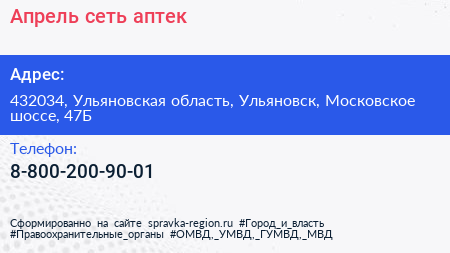 Апрель, сеть аптек по адресу 432034, Ульяновская область, Ульяновск, Московское шоссе, 47Б в дальнейшем Организация, размещена в следующих категориях: