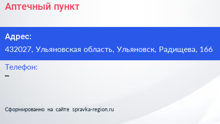 Аптечный пункт по адресу 432027, Ульяновская область, Ульяновск, Радищева, 166 в дальнейшем Организация, размещена в следующих категориях: