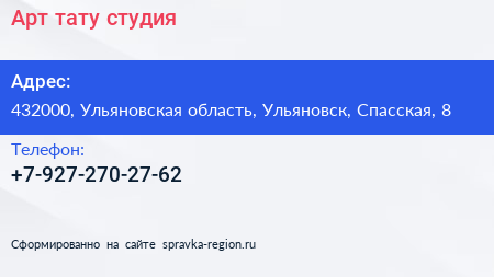 Арт-тату студия по адресу 432000, Ульяновская область, Ульяновск, Спасская, 8 в дальнейшем Организация, размещена в следующих категориях: