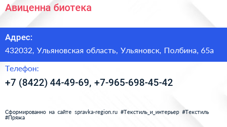 Авиценна, биотека по адресу 432032, Ульяновская область, Ульяновск, Полбина, 65а в дальнейшем Организация, размещена в следующих категориях: