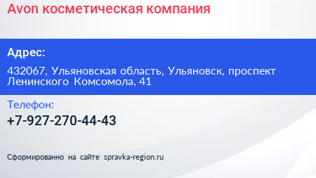 Avon, косметическая компания по адресу 432067, Ульяновская область, Ульяновск, проспект Ленинского Комсомола, 41 в дальнейшем Организация, размещена в следующих категориях: