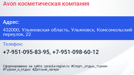 Avon, косметическая компания по адресу 432000, Ульяновская область, Ульяновск, Комсомольский переулок, 22 в дальнейшем Организация, размещена в следующих категориях: