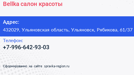 Bellka, салон красоты по адресу 432029, Ульяновская область, Ульяновск, Рябикова, 61/37 в дальнейшем Организация, размещена в следующих категориях: