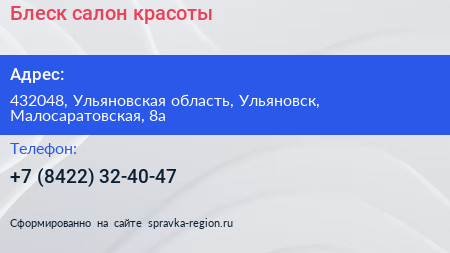 Блеск, салон красоты по адресу 432048, Ульяновская область, Ульяновск, Малосаратовская, 8а в дальнейшем Организация, размещена в следующих категориях: