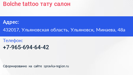 Bolche.tattoo, тату-салон по адресу 432017, Ульяновская область, Ульяновск, Минаева, 48а в дальнейшем Организация, размещена в следующих категориях:
