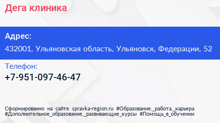 Дега, клиника по адресу 432001, Ульяновская область, Ульяновск, Федерации, 52 в дальнейшем Организация, размещена в следующих категориях: