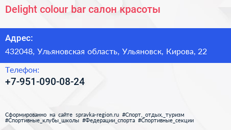 Delight colour-bar, салон красоты по адресу 432048, Ульяновская область, Ульяновск, Кирова, 22 в дальнейшем Организация, размещена в следующих категориях: