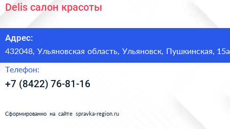 Delis, салон красоты по адресу 432048, Ульяновская область, Ульяновск, Пушкинская, 15а в дальнейшем Организация, размещена в следующих категориях: