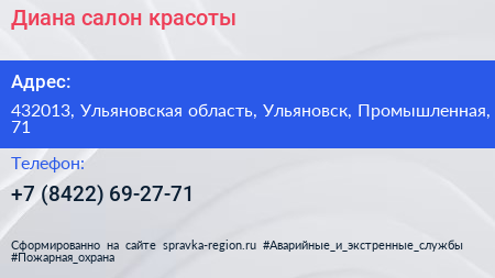 Диана, салон красоты по адресу 432013, Ульяновская область, Ульяновск, Промышленная, 71 в дальнейшем Организация, размещена в следующих категориях: