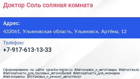 Доктор Соль, соляная комната по адресу 432061, Ульяновская область, Ульяновск, Артёма, 12 в дальнейшем Организация, размещена в следующих категориях: