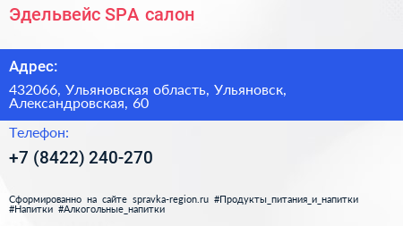 Эдельвейс, SPA-салон по адресу 432066, Ульяновская область, Ульяновск, Александровская, 60 в дальнейшем Организация, размещена в следующих категориях: