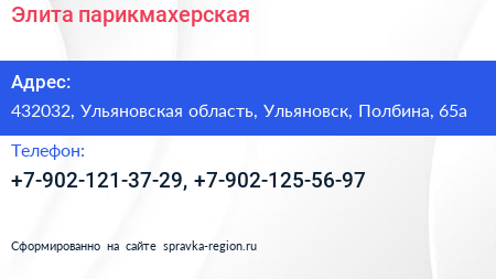 Элита, парикмахерская по адресу 432032, Ульяновская область, Ульяновск, Полбина, 65а в дальнейшем Организация, размещена в следующих категориях: