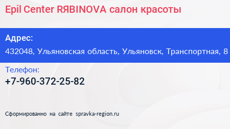 Epil Center RЯBINOVA, салон красоты по адресу 432048, Ульяновская область, Ульяновск, Транспортная, 8 в дальнейшем Организация, размещена в следующих категориях: