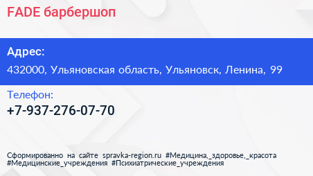 FADE, барбершоп по адресу 432000, Ульяновская область, Ульяновск, Ленина, 99 в дальнейшем Организация, размещена в следующих категориях:
