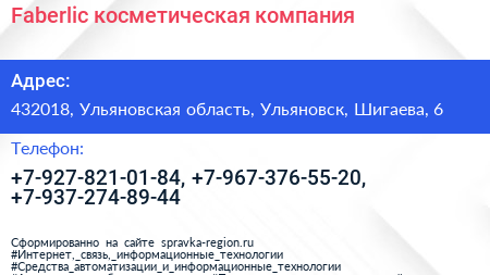 Faberlic, косметическая компания по адресу 432018, Ульяновская область, Ульяновск, Шигаева, 6 в дальнейшем Организация, размещена в следующих категориях: