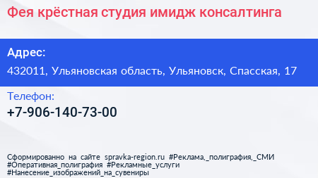 Фея крёстная, студия имидж-консалтинга по адресу 432011, Ульяновская область, Ульяновск, Спасская, 17 в дальнейшем Организация, размещена в следующих категориях: