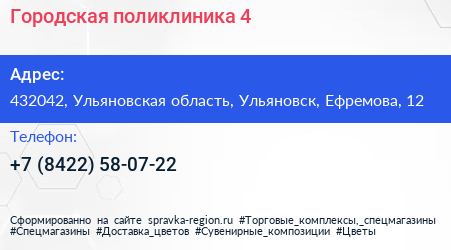 Городская поликлиника №4 по адресу 432042, Ульяновская область, Ульяновск, Ефремова, 12 в дальнейшем Организация, размещена в следующих категориях: