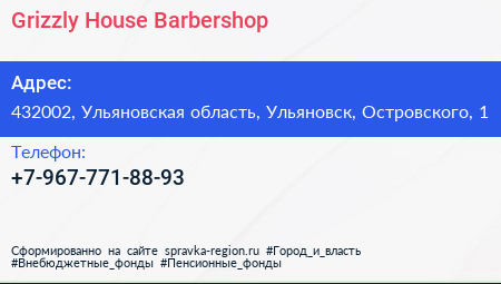 Grizzly House Barbershop по адресу 432002, Ульяновская область, Ульяновск, Островского, 1 в дальнейшем Организация, размещена в следующих категориях: