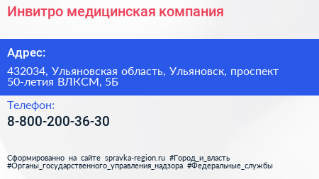 Инвитро, медицинская компания по адресу 432034, Ульяновская область, Ульяновск, проспект 50-летия ВЛКСМ, 5Б в дальнейшем Организация, размещена в следующих категориях: