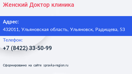 Женский Доктор, клиника по адресу 432011, Ульяновская область, Ульяновск, Радищева, 53 в дальнейшем Организация, размещена в следующих категориях: